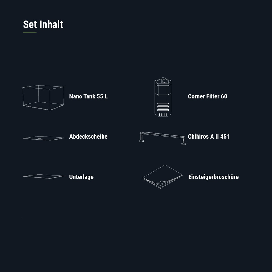 Μίνι σετ ενυδρείου με φωτισμό, φίλτρο και φυλλάδιο για αρχάριουςΕφέ υψηλού βάθους για έναν ιδιαίτερα φυσικό σχεδιασμό ενυδρείουΈνα μικρό κομμάτι της φύσης για το σπίτι σαςΙδανικό για φυτά, γαρίδες και σαλιγκάριαΜίνι Σετ ΕνυδρείουΜοντέρνος και συμπαγής σχεδιασμός σε συνδυασμό με την παράδοση και την ποιότητα. Αυτό συνδυάζουν τα ενυδρεία Dennerle με τους Nano Cubes και τα Nano Tanks. Ο συμπαγής σχεδιασμός σας επιτρέπει να ζήσετε ένα κομμάτι της φύσης στο σπίτι σας, ακόμη και σε έναν μικρό χώρο. Ένα οπτικό χαρακτηριστικό για κάθε δωμάτιο - κυρίως λόγω των στρογγυλεμένων γωνιών, που επιτρέπουν μια πανοραμική θέα στο ενυδρείο. Διαμορφωμένη από τη σκηνή του aquascaping, προέκυψε μια εντελώς νέα δημιουργία - το Dennerle Nano Tank. Ειδικό εφέ βάθους - αυτός ήταν ο στόχος που θέσαμε στους εαυτούς μας, τον οποίο οι νανο-δεξαμενές μας δημιουργούν μέσω των αναλογιών τους. Σε συνεργασία με την Chihiros, το σετ τεχνολογίας της σειράς Nano Tank Plant Pro περιλαμβάνει το Chihiros A II σε κατάλληλο μήκος εκτός από το δοκιμασμένο εσωτερικό μας φίλτρο. Με αυτόν τον ελεγχόμενο από την εφαρμογή και ισχυρό φωτισμό, πετυχαίνουν και τα πιο απαιτητικά υδάτινα τοπία Nano Tank Plant Pro, 55LΜέγεθος 55Lπάχος γυαλιού 5 χιλιοστάτύπος νερού Γλυκό νερόΔιαστάσειςΜήκος 45 εκ βάθος 36 εκ Υψος 34 εκμαξιλαράκι ασφαλείαςΓωνιακό φίλτρο 60Chihiros AII 451φυλλάδιο για αρχάριους Nano Tank Plant Pro, 55 LMini aquarium set incl. lighting, filter and startup brochureSet incl. lighting, filter and startup brochureHigh depth effect for a particularly natural aquarium designA little piece of nature for your homeIdeal for plants, shrimp, crayfish, snails and nano-fishMini Aquarium SetModern and compact design combined with tradition and quality. This is what the Dennerle aquaria combine with the Nano Cubes and Nano Tanks. The compact design allows you to experience a piece of nature in your own home, even in a small space. A visual highlight for any room – this is due not least to the rounded corners, which provide a panoramic view of the aquarium. Influenced by the aquascaping scene, a completely new creation was born – the Dennerle Nano Tank. Special depth effect – that was the goal we set ourselves, which our Nano Tanks create through their proportions. In cooperation with Chihiros, the technology set of the Nano Tank Plant Pro series includes, in addition to our proven internal filter, the Chihiros A II in a suitable length. With this app-controlled and powerful lighting succeed even the most demanding aquascapes.   SpecificationProduct informationProduct nameNano Tank Plant Pro, 55 LArticle number3315Glass thickness5 mmWater typeFreshwaterDimensionsWidth45 cmDepth36 cmHeight34 cmDelivery scopeNano Tank, 55 LCover panelUnderlayCorner Filter 60Chihiros AII 451Starter guide