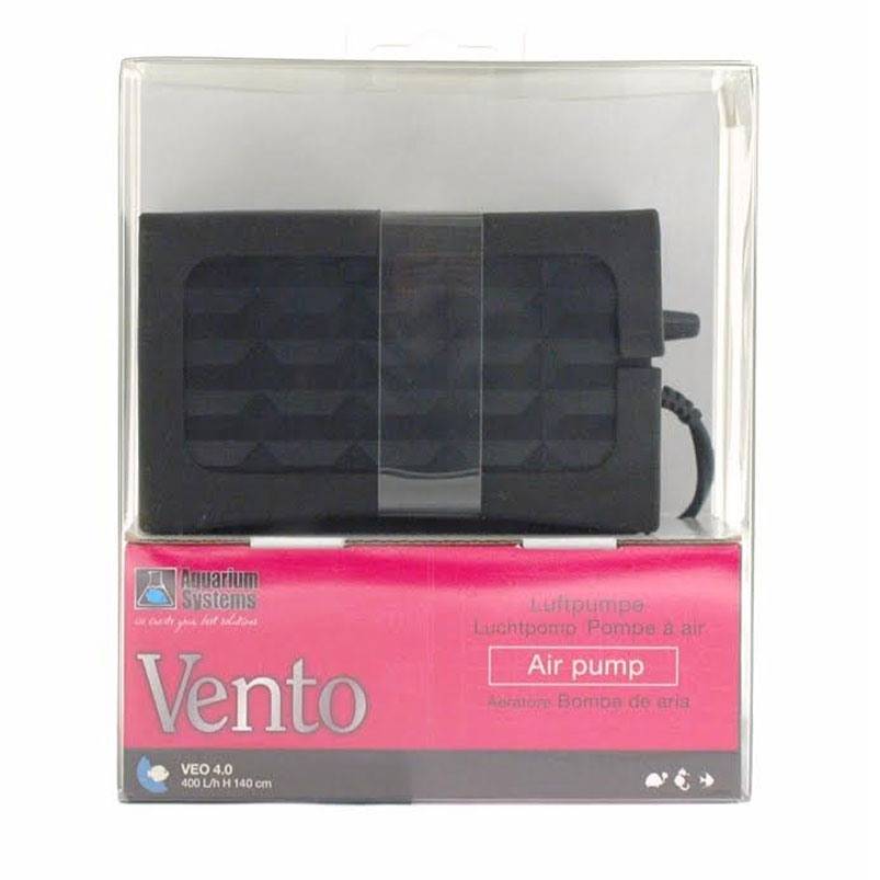 Η σειρά αντλιών αέρα ενυδρείου Aquarium Systems Series Vento προσφέρει χαμηλή κατανάλωση ενέργειας και ισχυρή έξοδο αέρα ακόμη και στα βαθύτερα ενυδρεία. Τα κύρια χαρακτηριστικά τους είναι η ευελιξία και η σιωπή. Εξαιρετικά ήσυχη, η εσωτερική της κατασκευή μειώνει τον θόρυβο λειτουργίας καθώς και τον θόρυβο συντονισμού. Επιπλέον, μπορείτε να προσαρμόσετε στην Vento αεραντλία σας ένα πολύχρωμο και διακοσμητικό καπιτονέ μπουφάν που θα αυξήσει την απορρόφηση του θορύβου και των κραδασμών προσθέτοντας ένα άγγιγμα στυλ.Η αεραντλία Aquarium Systems Air Pump Vento 4.0 έχει διπλές εξόδους αέρα με παροχή 200 λ/ω έκαστη, περιλαμβάνει 2 σωλήνες εύκαμπτου σωλήνα αέρα, 2 διαχύτες οξυγόνου και 2 βαλβίδες αντεπιστροφής.Αυτό το μοντέλο αεραντλίας Vento 4.0 σε αντίθεση με όλα τα υπόλοιπα της σειράς Vento, είναι εξοπλισμένο με ηλεκτρονικό ελεγκτή ροής αέρα.Πλεονεκτήματα:Ευελιξία και σιωπή.Εξαιρετικά αθόρυβη, με εναλλάξιμο προφυλακτήρα από ελαστικό καπιτονέ μπουφάν κέλυφος για να μειώνει τον κραδασμό και τον υπολειπόμενο θόρυβο. Δυνατότητα προσαρμογής του VENTO με διαφορετικό προφυλακτήρα χρώματος.Χαμηλή κατανάλωση ενέργειας.Ισχυρή ροή αέρα ακόμα και στα βαθύτερα ενυδρεία.Ποιοτικά συστήματα αντλιών αέρα ενυδρείων, 2 χρόνια εγγύηση.Παρέχεται με 2 σωλήνες αέρα 2 μέτρων έκαστος, 2 βαλβίδες αντεπιστροφής και 2 διαχύτες οξυγόνου 25 mm, Όλες οι αντλίες αέρα της σειράς Vento έρχονται με 1 ανταλλακτικό τσόχινο φίλτρο αέρα.Χαρακτηριστικά:Μέγιστη ταχύτητα ροής: 2 x 200 λίτρα ανά ώρα = 400 λ / ωΕξόδους αέρα: 2Ρυθμιζόμενη ροή: εξοπλισμένο με ηλεκτρονικό ελεγκτή ροής αέραΜέγιστο Βάθος νερού: 1,70 μέτραΙσχύς: 4 ΒαττΔιαστάσεις: μήκος 142 πλάτος 75 και ύψος 81,2 χιλιοστά.Ιδανικό για ενυδρείο μέχρι 800 λίτρα The Aquarium Systems Vento Series offers low power consumption and a strong air outlet even in deeper aquariums. Their main features are flexibility and silence. Extremely quiet, its internal design reduces operating noise as well as resonant noise. In addition, you can customize your Vento Pump with a colorful and decorative quilted jacket that will increase the absorption of noise and vibration by adding a styling touch.The Aquarium Systems Air Pump Vento 4.0 has double air outlets with 200 l / h each, including 2 air hoses, 2 oxygen diffusers and 2 non-return valves.Benefits:Flexibility and silence.Extremely silent, with an interchangeable rubber bumper shell rubber bumper to reduce vibration and residual noise. VENTO can be adjusted with a different color protector.Low power consumption.Strong airflow even in deeper aquariums.Quality aquarium air pump systems, 2 year warranty.Supplied with 2 air tubes each 2 meters, 2 non-return valves and 2 oxygen diffusers 25 mm.This model air pump Vento 4.0, unlike the others in the Vento range, is equipped with an electronic flow controller.Characteristics:Maximum flow rate: 2 x 200 l/h = 400 l/hAir outlets: 2Adjustable flow: Equipped with an electronic air flow controllerMaximum Water Depth: 1.70 metersPower: 4 WattsDimensions: length 142 width 75 and height 81.2 mm.Ideal for aquarium up to 800 liters.