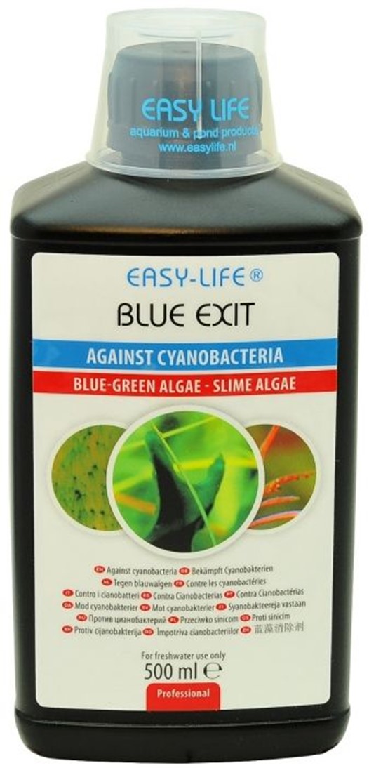 Καθαρό νερό χωρίς κυανοβακτήρια (μπλε-πράσινα άλγη)Το Blue Exit είναι ο νέος τρόπος για να απαλλαγείτε από τα κυανοβακτήρια (μπλε-πράσινα άλγη) σε γλυκού νερού ενυδρεία, χωρίς τη χρήση αντιβιοτικών ή ενώσεων που περιέχουν χαλκό.Τα κυανοβακτήρια (γνωστά και ως μπλε-πράσινα άλγη, γλίτσα ή επίστρωση άλγης) εμφανίζονται συχνά ως αποτέλεσμα υπερβολικής λίπανσης, διαταραγμένης βακτηριακής ισορροπίας, σοβαρά ρυπασμένου υποστρώματος (σήψη) ή πολύ χαμηλών επιπέδων νιτρικών.Το Blue Exit καταπολεμά αποτελεσματικά τα κυανοβακτήρια. Είναι εύκολο και ασφαλές στη χρήση, και ακίνδυνο για τα ψάρια, τις γαρίδες, τα μαλάκια και τα φυτά.Σε περίπτωση σοβαρής προσβολής, η αγωγή με Blue Exit μπορεί να παραταθεί για μερικές ημέρες, ακόμη και με διπλή δόση.ΧρήσηΘεραπεία 5 ημερώνΔοσολογία: 10 ml ανά 80 λίτρα καθημερινά για 5 συνεχόμενες ημέρες.Αφαιρέστε τα απορροφητικά υλικά (όπως ενεργό άνθρακα). Ανακινήστε καλά πριν τη χρήση.Τα κυανοβακτήρια εξαφανίζονται εντός 10 ημερών από την τελευταία δόση.Από την πρώτη δόση και για 14 ημέρες μετά, μην αλλάζετε ή συμπληρώνετε νερό και μην χρησιμοποιείτε απορροφητικά υλικά.Προληπτική χρήση: 10 ml ανά 80 λίτρα, μία φορά την εβδομάδα.