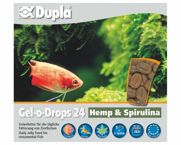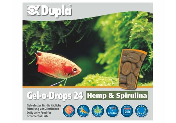 Ζελέ τροφή για καθημερινή σίτιση καλλωπιστικών ψαριώνΤο καινοτόμο Gel-O-Drops 24 είναι φτιαγμένο από ειδικό ζελέ τροφίμων που είναι τέλειο για την καθημερινή διατροφή όλων των τροπικών διακοσμητικών ψαριών, μεγάλων και μικρών. Η καινοτόμος τροφή ψαριών είναι επίσης ιδανική ως λιχουδιά στο ενδιάμεσο και εξασφαλίζει αλληλεπίδραση με τον φύλακα και διασκέδαση για τα ψάρια. Οι σταγόνες έχουν εντυπωσιακά υψηλή περιεκτικότητα σε απαραίτητες βιταμίνες, αποδόσεις πρωτεΐνης υψηλής ποιότητας, μέταλλα και φυσικούς ενισχυτές χρώματος και κρατούν τους κατοίκους του ενυδρείου σας σε φόρμα και ζωτικότητα. Οι εύκολες και μεμονωμένα αφαιρούμενες μερίδες φαγητού σάς επιτρέπουν να προσδιορίζετε την ποσότητα του φαγητού με μεγάλη ακρίβεια για να αποτρέψετε την υπερβολική σίτιση των ζώων και την προσθήκη περίσσειας θρεπτικών συστατικών στο ενυδρείο. Η αποστειρωμένη και άσηπτη συσκευασία διατηρεί το φαγητό φρέσκο ​​για μεγάλο χρονικό διάστημα. Το Gel-O-Drops 24 παραμένει φρέσκο ​​για 24 μήνες χωρίς ψυγείο. Η ειδική φόρμουλα των μοναδικών σταγόνων αποτρέπει σχεδόν πλήρως την απελευθέρωση υπερβολικών θρεπτικών συστατικών στο νερό για να μειώσει τον κίνδυνο υπερβολικής ρύπανσης του νερού και συναφών προβλημάτων όπως η ανεπιθύμητη ανάπτυξη φυκιών.Το ζελέ τροφίμων γίνεται πολύ καλά αποδεκτό από ψάρια, γαρίδες κ.λπ.Τα Gel-O-Drops 24 + Hemp & Spirulina είναι H ΠΡΩΤH! καλλωπιστική τροφή ψαριών με προσθήκη 4 % κάνναβης σε μορφή αλεύρου κάνναβης. Η κάνναβη προάγει σημαντικά τη ζωτικότητα και τη διατήρηση της υγείας των ψαριών σας. Εξάλλου, η κάνναβη είναι η ιδανική φυτική πηγή για πρωτεΐνες, αμινοξέα και ακόρεστα λιπαρά οξέα (π.χ. λινολεϊκό οξύ και άλφα-λινολενικό οξύ). Για παράδειγμα, η κάνναβη περιέχει 65 % σφαιρίνη και 35 % πρωτεΐνες αλβουμίνης. Αυτά μπορούν να απορροφηθούν και να χρησιμοποιηθούν ιδιαίτερα από τα ψάρια. Η κάνναβη περιέχει επιπλέον πολλά σημαντικά μέταλλα όπως νάτριο, μαγγάνιο, ψευδάργυρο, χαλκό, σίδηρο, ασβέστιο, μαγνήσιο, κάλιο και φώσφορο. Όλα αυτά είναι ζωτικής σημασίας για μια υγιή και μεγάλη διάρκεια ζωής των ψαριών! Οι σπόροι κάνναβης βιολογικής ποιότητας προέρχονται από την ΕΕ και η ποικιλία κάνναβης που χρησιμοποιείται είναι φυσικά απαλλαγμένη από THC και φυτοφάρμακα. Αυτό επιβεβαιώθηκε από εργαστηριακές εξετάσεις. Τα συστατικά των φυκών σπιρουλίνας και προσεκτικά επιλεγμένα άλλα φυτικά συστατικά προάγουν την υγιή ανάπτυξη, αυξάνουν τη ζωτικότητα και ενισχύουν το ανοσοποιητικό σύστημα των ψαριών ενυδρείου.Οφέλη προϊόντος με μια ματιά:κατάλληλο για όλα τα τροπικά διακοσμητικά ψάρια μεγάλα και μικράπρωτοποριακή και ειδική ζελατίνα τροφήςιδανικό για καθημερινή σίτισηκατάλληλο και ως κέρασμα ενδιάμεσαεξασφαλίζει πολλή αλληλεπίδραση και διασκέδαση για τα ψάριαπλούσιο σε απαραίτητες βιταμίνες, υψηλής ποιότητας πρωτεΐνες, μέταλλα και φυσικά ενισχυτικά χρώματοςκρατά τους κατοίκους του ενυδρείου σε φόρμα και ζωτικότηταεύκολη δοσολογία χάρη στις μεμονωμένα αφαιρούμενες μερίδες φαγητούπαραμένει φρέσκο ​​για μεγάλο χρονικό διάστημα - διάρκεια ζωής 24 μήνες χωρίς ψυγείοΗ ειδική φόρμουλα αποτρέπει σχεδόν πλήρως την απελευθέρωση υπερβολικών θρεπτικών συστατικών στο νερό.μειώνει τον κίνδυνο υπερβολικής ρύπανσης του νερού και συναφών προβλημάτων όπως η ανεπιθύμητη ανάπτυξη φυκιώναποδεκτό εξαιρετικά από τα ψάρια, τις γαρίδες κ.λπ.Περιεχόμενα: 1