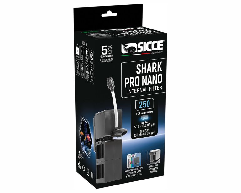 Το φίλτρο ενυδρείου εσωτερικό Sicce Shark Pro Nano 250 αποτελεί την ιδανική επιλογή για την διατήρηση καθαρού και υγιούς περιβάλλοντος στο ενυδρείο σας. Σχεδιασμένο για μέγιστη απόδοση, το φίλτρο αυτό προσφέρει ροή νερού έως 250 λίτρα ανά ώρα, εξασφαλίζοντας την αποτελεσματική κυκλοφορία και φιλτράρισμα του νερού. Με το κομψό και συμπαγές του σχέδιο, το Sicce Shark Pro Nano 250 μπορεί εύκολα να τοποθετηθεί σε οποιοδήποτε ενυδρείο, προσφέροντας παράλληλα αθόρυβη λειτουργία και χαμηλή κατανάλωση ενέργειας.