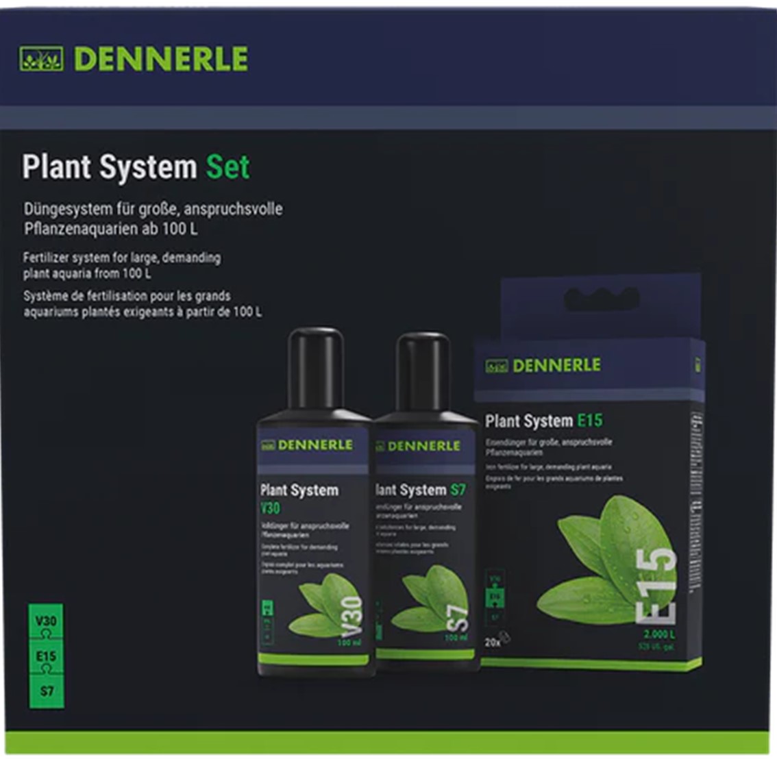 Αυτό το σετ λιπασμάτων αναπτύχθηκε ειδικά για ενυδρεία κοινότητας με μεγάλη φυτεία. Αυτός ο τύπος ενυδρείου χαρακτηρίζεται από φύτευση περίπου. 70 – 80 % της επιφάνειας του πυθμένα, εκ των οποίων περίπου. Τα μισά είναι ταχέως αναπτυσσόμενα είδη και καλές συνθήκες ανάπτυξης (καλός φωτισμός, παροχή CO 2 ). Το σύστημα λιπασμάτων αποτελείται από 3 συστατικά, τα οποία εγγυώνται ομοιόμορφη και συνεχή παροχή θρεπτικών συστατικών:S7 = ζωτικές ουσίεςΕ15 = λίπασμα σιδήρουPlant System V30 = πλήρες λίπασμαΌλα τα συστατικά του λιπάσματος είναι εξαιρετικά συμπυκνωμένα και πολύ παραγωγικά. Το σύστημα λιπασμάτων είναι επομένως ιδιαίτερα κατάλληλο για μεγάλα ενυδρεία από 100 λίτρα.Δοσολογία:S7:Εβδομαδιαία 3 ml ανά 100 L νερού ενυδρείουΕ15:Κάθε 4 εβδομάδες (π.χ. πάντα στις 15 του μήνα) 1 ταμπλέτα σε 100 L νερό ενυδρείουV30:Κάθε 4 εβδομάδες (π.χ. πάντα στις 30 του μήνα) 3 ml σε 100 L νερό ενυδρείου