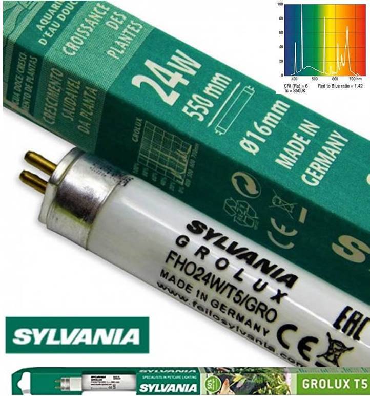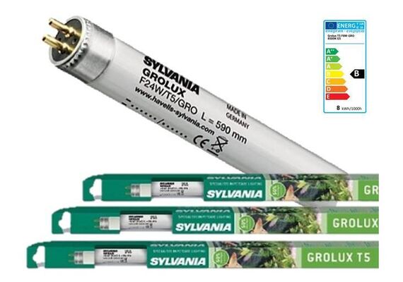 Οι λαμπτήρες Sylvania Grolux υποστηρίζουν την υγιή ανάπτυξη των φυτών. Χρησιμοποιώντας φάσμα 5 ζωνών, το φάσμα που απαιτείται για τα φυτά καλύπτεται πλήρως. Δυστυχώς, η ποσότητα του φωτός δεν είναι αρκετή, γι 'αυτό οι λαμπτήρες δίνονται σε συνδυασμό με 3 λωρίδες φως (οι διεθνείς ενδείξεις ξεκινούν με 8) βέλτιστα αποτελέσματα. Το φως ενισχύει τα χρώματα των ψαριών και των φυτών. Το Sylvania Gro-Lux T5 ενισχύει τα φυσικά χρώματα των υδρόβιων φυτών και των ψαριών στα ενυδρεία και ως εκ τούτου είναι ο ιδανικός λαμπτήρας για όλα τα ενυδρεία φρέσκου νερού. Η λάμπα Gro-Lux T5 προωθεί τη διαδικασία φωτοσύνθεσης στα φυτά. Το υψηλό επίπεδο της μπλε και κόκκινης ακτινοβολίας συμβάλλει στην προώθηση υγιούς ανάπτυξης των φυτών Το φωτεινό χρώμα αυτού του λαμπτήρα είναι 8500 Κ. Αυτός ο λαμπτήρας φθορισμού μπορεί να χρησιμοποιηθεί μόνο σε ειδικούς λαμπτήρες T5 με πρίζες διαμέτρου 16 mm.Sylvania Gro-Lux T5:+ Υψηλό επίπεδο μπλε και κόκκινης ακτινοβολίας συμβάλλει στην προώθηση της υγιούς ανάπτυξης των φυτών+ Ενισχύει τα φυσικά χρώματα των υδρόβιων φυτών και των ψαριών στα ενυδρεία+ Προωθεί τη διαδικασία σύνθεσης φωτογραφιών στα φυτά+ Παλαιότερο, αλλά πιο βέλτιστο χρώμα φωτός για τα φυτά και τα ενυδρεία+ T5 - FHO: υψηλή απόδοση και αυλό ανά watt σε σύγκριση με τις εκδόσεις T8+ 50% περισσότερη απόδοση φωτός σε σύγκριση με το ίδιο μήκος στο T8.+ Ιδανική για τη νέα γενιά ενυδρείων με λαμπτήρες T5, αλλά με το μήκος των λαμπτήρων T8.+ Η ιδανική εφαρμογή των λαμπτήρων στο ενυδρείο έχει ως αποτέλεσμα τον τέλειο φωτισμό του ενυδρείου+ Για φωτισμό ενυδρείων γλυκού νερού+ Πλήρης ή πρόσθετος τεχνητός φωτισμός φυτών The Sylvania Gro-Lux T5 strengthens the natural colours of aquatic plants and fish in aquariums and is therefore the ideal lamp for all freswater aquariums. The Gro-Lux T5 lamp promotes the process of photosynthesis in plants. High level of blue and red radiation helps promote healthy plant growth. The light coloure of this lamp is 8500 K. This fluorescent tube can only be use in special T5 lamps with 16 mm diameter sockets.Sylvania Gro-Lux T5:+ High level of blue and red radiation helps promote healthy plant growth+ Strengthens the natural colours of aquatic plants and fish in aquariums+ Promotes the process of photo synthesis in plants+ Oldest, but most optimal light colour for plants and aquaria+ T5 - FHO: high output and lumen per watt in comparison to T8 versions+ 50% more light output in comparison to the same length in T8.+ Ideal for the new generation of aquaria with T5 lamps, but in the length of T8 lamps.+ The ideal fit of the lamps in the aquarium results in a perfect illumination of the aquarium+ For lighting of fresh water aquariums+ Complete or additional artificial lighting of plants