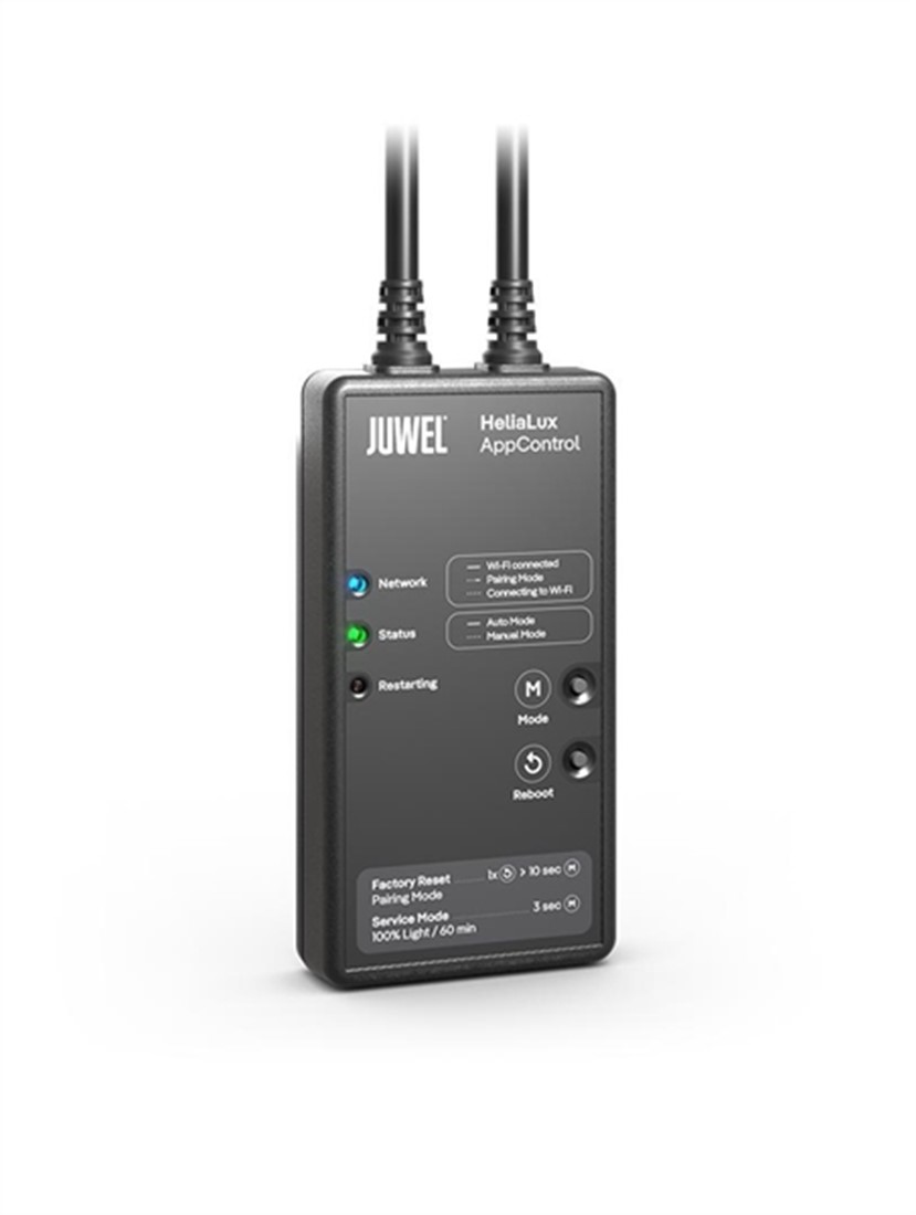 Ζήστε την επανάσταση στον φωτισμό ενυδρείων με το Juwel HeliaLux AppControl!Βυθιστείτε στον κόσμο του έξυπνου φωτισμού ενυδρείου με το Juwel HeliaLux AppControl. Αυτή η καινοτόμος μονάδα ελέγχου σάς επιτρέπει να ελέγχετε εύκολα τον φωτισμό LED Juwel HeliaLux μέσω του smartphone ή του tablet σας. Με το Juwel HeliaLux AppControl, μπορείτε εύκολα να συνδέσετε το φως LED Juwel HeliaLux Spectrum στην εφαρμογή MyJuwel μέσω WLAN και να το ελέγχετε από οπουδήποτε. Απολαύστε την ελευθερία προσαρμοσμένου σχεδιασμού και ελέγχου του φωτισμού του ενυδρείου σας.Juwel HeliaLux AppControl -Control LED-διαισθητική λειτουργία: Η φιλική προς το χρήστη εφαρμογή είναι διαθέσιμη τόσο για iOS όσο και για Android. Μπορείτε να προσαρμόσετε τα χρώματα του φωτός, την ένταση και το χρόνο ξεχωριστά με λίγα μόνο αγγίγματα.ευελιξία και έλεγχος: Προγραμματίστε τον φωτισμό σας σύμφωνα με τις επιθυμίες σας - από απαλές ανατολές και ηλιοβασιλέματα μέχρι ειδικά εφέ φεγγαριού. Δημιουργήστε τα δικά σας προφίλ φωτός ή επιλέξτε από προκαθορισμένα σενάρια.ενεργειακά αποδοτικός: Ο ακριβής έλεγχος της έντασης του φωτός εξοικονομεί ενέργεια και παρατείνει τη διάρκεια ζωής των LED σας.απλή εγκατάσταση: Το Juwel HeliaLux AppControl συνδέεται απλώς μεταξύ της λυχνίας LED Juwel HeliaLux και της μονάδας τροφοδοσίας. Η εγκατάσταση είναι γρήγορη και απλή.Συμβατότητα: Το Juwel HeliaLux AppControl είναι συμβατό με όλα τα φώτα LED Juwel HeliaLux και επομένως προσφέρει απρόσκοπτη ενσωμάτωση στο υπάρχον σύστημά σας.πλήρης έλεγχος χρώματος WRGBκαθημερινές ρουτίνες συμπεριλαμβανομένων. εφέ σύννεφωνχρησιμοποιήστε προκατασκευασμένα προφίλ βιοτόπωνπροσβάσιμο σε όλη τη λέξησυμβατός φωνητικός βοηθόςΓιατί το Juwel HeliaLux AppControl; Με το Juwel HeliaLux AppControl, μπορείτε να αξιοποιήσετε στο έπακρο τον φωτισμό του ενυδρείου σας. Προσαρμόζοντάς το στις ανάγκες των ψαριών και των φυτών σας, μπορείτε να δημιουργήσετε τις βέλτιστες συνθήκες διαβίωσης και να δημιουργήσετε το τέλειο σκηνικό για το ενυδρείο σας.Παραγγείλετε τώρα και ζήστε το μέλλον του φωτισμού ενυδρείων με το Juwel HeliaLux AppControl!Δώστε στο ενυδρείο σας το τέλειο φως - απλά, έξυπνα και αποτελεσματικά. Experience the revolution in aquarium lighting with the Juwel HeliaLux AppControl!Immerse yourself in the world of intelligent aquarium lighting with the Juwel HeliaLux AppControl. This innovative control unit allows you to conveniently control your Juwel HeliaLux LED lighting via your smartphone or tablet. With the Juwel HeliaLux AppControl, you can easily connect your Juwel HeliaLux Spectrum LED light to the MyJuwel app via WLAN and control it from anywhere. Enjoy the freedom of customised planning and control of your aquarium lighting.Juwel HeliaLux AppControl -LED Controller-intuitive operation: The user-friendly app is available for both iOS and Android. You can adjust the light colours, intensity and timing individually with just a few taps.flexibility and control: Programme your lighting according to your wishes - from gentle sunrises and sunsets to special moonlight effects. Create your own light profiles or choose from predefined scenarios.energy-efficient: Precise control of the light intensity saves energy and extends the service life of your LEDs.simple installation: Juwel HeliaLux AppControl is simply connected between your Juwel HeliaLux LED light and the power supply unit. Setup is quick and uncomplicated.Compatibility: Juwel HeliaLux AppControl is compatible with all Juwel HeliaLux LED lights and therefore offers seamless integration into your existing system.full WRGB colour controldaily routines incl. clouds effectsuse prefabricated biotope profileswordwide accessiblevoice assistant compatibleWhy Juwel HeliaLux AppControl?With the Juwel HeliaLux AppControl, you can get the best out of your aquarium lighting. By customising it to the needs of your fish and plants, you can create optimum living conditions and set the perfect scene for your aquarium.Order now and experience the future of aquarium lighting with the Juwel HeliaLux AppControl!Give your aquarium the perfect light - simply, intelligently and efficiently.