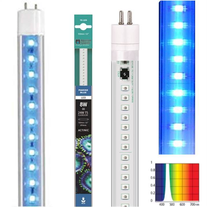 Οι λαμπτήρες Led T5 χρησιμοποιούνται για την αντικατάσταση των λαμπτήρων φθορισμού T5 ίδιου μεγέθους. Μια λυχνία LED T5 χρησιμοποιεί 1/3 ηλεκτρικής ενέργειας που παράγει διπλάσιο φως σε σύγκριση με τους λαμπτήρες φθορισμού. Προσθέτουν ένα εφέ κυματισμού. Ακόμη και μία λυχνία LED T5 κάνει τη διαφορά. Ο λαμπτήρας στρέψης περιστρέφεται για να κατευθύνει σωστά το φως.Marine Blue T5 Led:- Περιέχει ακτινοφωτιστικό φως υψηλής ενέργειας- Το Bio φθορίζει τα κοράλλια- Τρεις διαφορετικές μπλε ledsThe T5 Led lamps are used to replace T5 fluorescent lamps of the same size. A T5 Led lamp uses 1/3 electricity producing double the light compared to fluorescent lamps. They add a ripple effect. Even one T5 Led lamp makes a difference. Lampholder rotates to direct light correctly.Marine Blue T5 Led:- Contains high energy actinic light- Bio fluoresces corals- Three different blue leds