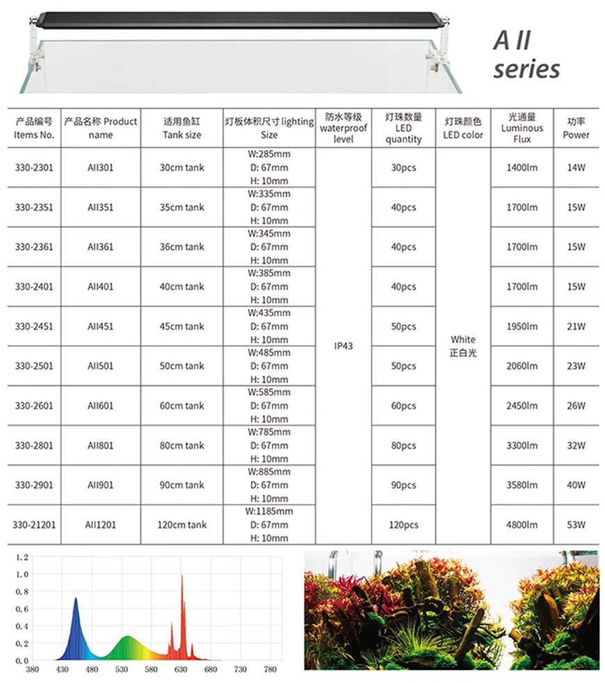 Το μέγιστο πάχος γυαλιού για την ακρυλική βάση είναι 8 mm.Τα φώτα LED της σειράς A II της Chihiros είναι ειδικά σχεδιασμένα για ενυδρεία γλυκού νερού με πυκνή φυτεία. Οι λαμπτήρες πλήρους φάσματος καλύπτουν ένα φασματικό εύρος περίπου. 400 - 700 nm, με ισχυρή εστίαση στο κόκκινο και μπλε φάσμα χωρίς συμβιβασμούς στις πράσινες και κίτρινες ακτίνες. Τα μεμονωμένα LED έχουν θερμοκρασία χρώματος περίπου 8.000 Kelvin και είναι διατεταγμένα σε 3 σειρές σε ολόκληρη τη λάμπα για να εξασφαλίσουν έναν καλά ισορροπημένο φωτισμό ώστε να μην δημιουργούνται σκιές.Τα LED είναι εξοπλισμένα με ενσωματωμένο ελεγκτή Bluetooth. Αυτό διαφοροποιεί το AII από τη σειρά Α, η οποία απαιτεί μια εξωτερική συσκευή για να αλλάξει το φάσμα. Η εφαρμογή σάς επιτρέπει να ρυθμίζετε εύκολα το χρονόμετρο, την ένταση του φωτός, τη ράμπα και την ανατολή/δύση του ηλίου μέσω του "My Chihiros APP".Με πλάτος 6,7 cm (2,64 ίντσες) και ύψος 1 cm (0,39 ίντσες), αυτά τα φώτα ενυδρείου έχουν λεπτή σχεδίαση, καθιστώντας τα να φαίνονται κομψά στο ενυδρείο σας εστιάζοντας περισσότερο σε φυτά και ζώα. Τα φώτα είναι προσαρτημένα σε μια διαφανή ακρυλική βάση, έτσι ώστε να μην αφαιρούν μεταλλικά στηρίγματα ή πόδια από την ομορφιά της φυτεμένης δεξαμενής σας, λειτουργώντας επίσης ως έμμεση ψύκτρα. Το A II διαθέτει ένα περιστρεφόμενο για να ρυθμίζει το LED δίνοντας στον ενυδρείο ένα ευρύ φάσμα επιλογών για να φωτίζει ένα ενυδρείο προς οποιαδήποτε κατεύθυνση.Για πυκνοφυτεμένες δεξαμενέςΛεπτό σχέδιοΕνσωματωμένο ελεγκτή BluetoothΠρογραμματίζεται μέσω της εφαρμογής "My Chihiros App"Για φυτά γλυκού νερούΑκρυλική βάση για τη ρύθμιση των φώτωνΤροφοδοτικό για επιπλέον προστασίαThe max glass thickness for the acrylic stand is 8mm.The A II series LED lights from Chihiros are specially designed for densely planted freshwater aquariums. Full-spectrum lamps cover a spectral range of approx. 400 - 700 nm, with strong focus on the red & blue spectrum without compromising green & yellow rays. The individual LEDs have a color temperature around 8.000 Kelvin & are arranged in 3 rows across the entire lamp to ensure a well-balanced illumination as to not cast any shadows.The LED are equipped with a built in Bluetooth controller. This differentiates the AII from the A series, which requires an external device to change the spectrum. The app allows you to easily set the timer, light intensity, ramping, & sunrise/sunset via "My Chihiros APP".With a width of 6.7cm(2.64in) & height of 1cm(0.39in), these aquarium lights are slim in design, making them look sleek on your aquarium focusing more on plants & livestock. The lights are attached to a transparent acrylic holder so no metal brackets or legs taking away from the beauty of your planted tank, also acting as an indirect heat sink. The A II features a swivel to adjust the LED giving the aquarist a wide range of options for illuminating an aquarium in any direction.For densely planted tanksSlim designBuilt-in Bluetooth controllerProgrammable through "My Chihiros App"For freshwater plantsAcrylic holder for adjusting lightsPower supply for extra protection