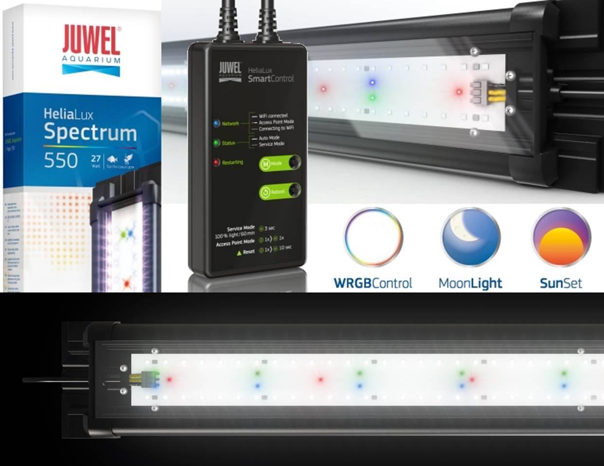 HeliaLux SpectrumΤο HeliaLux Spectrum είναι μια μονάδα φωτισμού LED υψηλής απόδοσης για το ενυδρείο JUWEL. Τα πλέον σύγχρονα, ειδικά ανεπτυγμένα LED SMD με μέγιστη απόδοση έχουν χρησιμοποιηθεί για να εξασφαλίσουν τη βέλτιστη ανάπτυξη των φυτών, να κάνουν τα λαμπρά χρώματα και να προωθήσουν τη ζωτικότητα του υποβρύχιου κόσμου σας.Το HeliaLux Spectrum είναι μια υψηλής απόδοσης μονάδα φωτισμού LED με πλήρες φάσμα. Οι τελευταίες τεχνολογικά ανεπτυγμένες οδηγήσεις SMD εγγυώνται μέγιστη απόδοση φωτός για τη βέλτιστη ανάπτυξη των φυτών, ενώ ταυτόχρονα επιτυγχάνουν εξοικονόμηση ενέργειας περίπου 50%. Οι λευκές λυχνίες LED φωτίζουν το ενυδρείο σας λαμπρά, ενώ τα κόκκινα, μπλε και πράσινα LED δημιουργούν έντονα χρώματα και μέγιστη αντίθεση στον υποβρύχιο κόσμο σας. Η απόλυτα συντονισμένη σειρά χρωμάτων προάγει τη ζωτικότητα των ψαριών σας και εξασφαλίζει τη βέλτιστη ανάπτυξη των φυτών.Δεν υπάρχουν όρια στο σχεδιασμό ή τον έλεγχο όταν χρησιμοποιούνται LED σε συνδυασμό με το HeliaLux SmartControl./>CombiLightΟ συνδυασμός λευκών λυχνιών LED 9000 K και 6500 K εξασφαλίζει ιδανική ανάπτυξη φυτών στο ενυδρείο JUWEL.<img src=