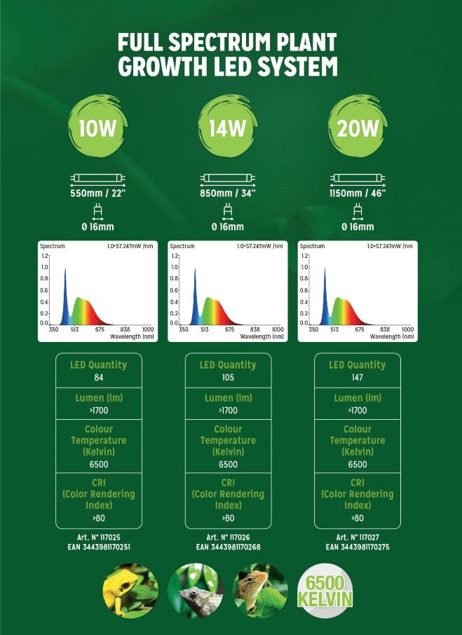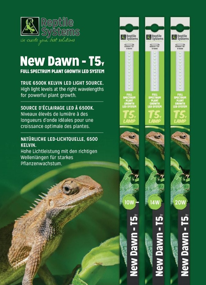 Πληροφορίες ΠροϊόντοςΈνα πρώτο στο είδος του LED υψηλής απόδοσης σχεδιασμένο για καλλιέργεια φυτών αλλά σε παραδοσιακό στυλ Τ5, ώστε να μπορεί να χρησιμοποιηθεί σε πολλά ήδη εγκατεστημένα συστήματα, καθιστώντας το ιδανικό για φυτεμένο βιβάριο.Το LED Dawn LED μπορεί να χρησιμοποιηθεί για να ενισχύσει τα χρώματα των ερπετών που δεν απαιτούν υπεριώδη ακτινοβολία, και παράλληλα με τον υπεριώδη φωτισμό για όσους το χρειάζονται. Χρησιμοποιήστε το για να αναδείξετε τη φυσική ομορφιά του terrarium ή άλλου περιβλήματος στο μέγιστο με αυτή τη συναρπαστική πηγή φωτός.Είναι επίσης ιδανικό για την καλλιέργεια ορχιδέων, σαρκοφάγων φυτών και άλλων εξωτικών λουλουδιών. Η συμπυκνωμένη πηγή φωτός εξασφαλίζει την εκπληκτική ανάπτυξη και υγεία των φυτών. Ως ζωτικό μέρος της φωτοσύνθεσης, η ανώτερη παραγωγή φωτός από τη Νέα Αυγή ενθαρρύνει τη μετατροπή του φωτός σε γλυκόζη, μεταξύ άλλων από τα οποία τα φυτά εξαρτώνται για ανάπτυξη και ενέργεια.Απλώς συνδέστε το LED σε έναν ελεγκτή T5 ή τον υπάρχοντα ελεγκτή T5.Βασικά χαρακτηριστικά:Υψηλά επίπεδα φωτός στα σωστά μήκη κύματος για ισχυρή ανάπτυξη των φυτών.Χρησιμοποιεί 1/3 ηλεκτρικής ενέργειας παράγοντας διπλάσιο φως από ισοδύναμο λαμπτήρα φθορισμού.Περιστρεφόμενα άκρα για να κατευθύνει σωστά το φως σωστά. Product InformationA first of its kind high output LED designed for growing plants but in a traditional T5 style so it can be used on many already installed systems, making it perfect for a planted vivarium.The NEW Dawn LED can be used to enhance the colours of reptiles that do not require UV, and alongside UV lighting for those that do. Use to show off the natural beauty of your terrarium or other enclosure to the maximum with this exciting light source.It is also ideal for growing Orchids, carnivorous plants and other exotic flowers. The concentrated light source ensures phenomenal plant growth and health. As a vital part of photosynthesis, the superior light output from the New Dawn encourages light conversion to glucose, amongst other things which plants depend on for growth and energy.Simply connect the LED to a T5 Controller or your existing T5 controller.Key Features:High light levels at the correct wavelengths for powerful plant growth.Uses 1/3 electricity producing double the light of an equivalent florescent lamp.Rotating ends to direct light correctly. PRODUCTLENGTHDIAMETERWATTLEDLUMENKELVINLIFE EXPECTANCY New Dawn T5 LED 10w550mm / 22"16mm10w8417006500k50,000 hours New Dawn T5 LED 14w850mm / 34"16mm14w10517006500k50,000 hours New Dawn T5 LED 20w1150mm / 46"16mm20w14717006500k50,000 hours