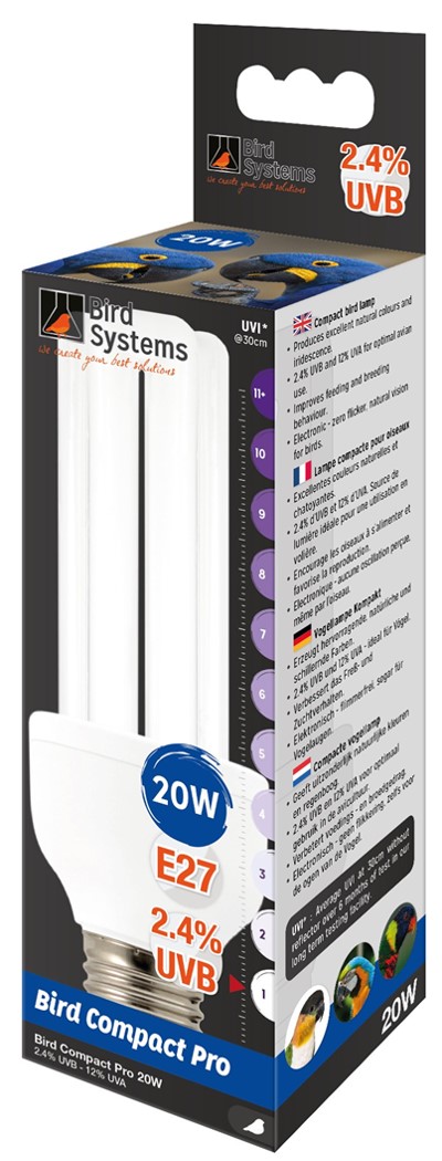 Συμπαγής λαμπτήρας 3U για πουλιά.UVI: 1UVI *: Μέσος όρος UVI στα 30cm χωρίς ανακλαστήρα για 6 μήνες δοκιμών στις μακροπρόθεσμες εγκαταστάσεις δοκιμών μας. • Εξαιρετικά φυσικά και λαμπερά χρώματα.• 2,4% UVB και 12% UVA. Ιδανική πηγή φωτός για χρήση σε κλουβί.• Ενθαρρύνει τα πουλιά να τρέφονται και προωθεί την αναπαραγωγή.• Ηλεκτρονικό - δεν γίνεται αντιληπτή ταλάντωση, ακόμη και από το πουλί.- Produces excellent natural colours and iridescence.Compact 3U lamp for birds.UVI: 1UVI *: Average UVI at 30cm without reflector over 6 months of testing at our long-term test facilities.• Excellent natural and shimmering colors.• 2.4% UVB and 12% UVA. Ideal light source for aviary use.• Encourages birds to feed and promotes reproduction.• Electronic - no oscillation perceived, even by the bird.