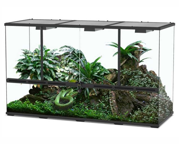 Colour: Black, SilverMeasurements: 132 x 45 x 75 cmEquipment: Terratlantis Security Lock; Air Ventilation System; Removable Cover and DoorsOptional: 3x Terrarium Lighting System 250 mm Terrarium RangeTerrarium RangeTerratlantis terrariums have a high quality aluminium structure, providing an excellent habitat for your reptiles and amphibians. They are also very nice to look at, so they can be combined with any environment. Our terrariums have now a lower aluminium profile so we can have a wider view to the interior. Although we kept the high profil in some models for the creation of paludariums. Available in different designs and sizes and two colours, black lacquered aluminium and anodized aluminium.New designOur aluminium terrariums have now a different look due to the lower profile that opens the field of vision on the habitat and the animal.New designPadlock with codePadlock with codeSecurity padlock with code on terrarium doors.Safety lock on doorsAll the terrariums include a safety lock on doors so you can block them quickly and easily.Safety lock on doorsAir circulation systemAir circulation systemAir extraction grids below the doors for excellent air circulation.Removable coverThe superior cover is completely removable to facilitate the acces to the terrarium interior.Removable coverRemovable front doorsRemovable front doorsFront doors completely removable for a better maintenance and an easy access to the interior.New Design CabinetsTwo different types of cabinets are available for this range. It's your choice!New Design Cabinets
