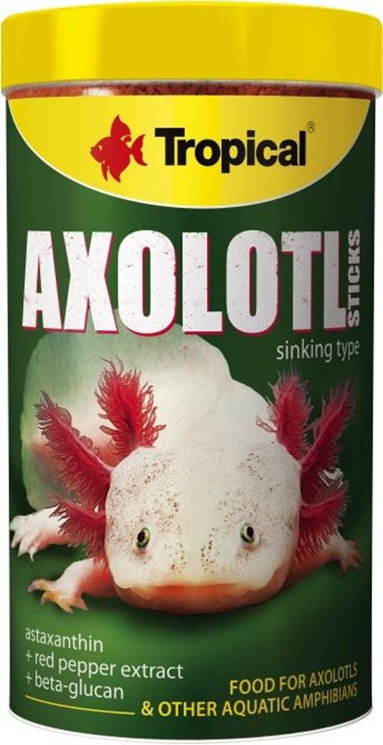 Ειδική τροφή με υψηλή περιεκτικότητα σε πρωτεΐνες, με τη μορφή βυθισμένων ραβδιών. Η ποικιλία των συστατικών ζωικής προέλευσης, συμπεριλαμβανομένων των ψαριών, των μαλακίων και των καρκινοειδών, είναι η πηγή υψηλής ποιότητας εύκολα αφομοιώσιμης πρωτεΐνης. Χάρη στη βέλτιστα ισορροπημένη σύνθεση βιταμινών και ιχνοστοιχείων, η τακτική σίτιση με AXOLOTL STICKS διασφαλίζει τη σωστή ανάπτυξη και ανάπτυξη στα αμφίβια και η προσθήκη ασταξανθίνης και εκχυλίσματος πιπεριού εντείνει τον χρωματισμό τους. ο φαγητό είναι επίσης εμπλουτισμένο με φυσικό διεγερτικό ανοσοποίησης; βήτα-γλυκάνη, η οποία βελτιώνει τα αμφίβια, σύστημα ανοσίας, διευκολύνοντας τις διαδικασίες αποκατάστασης σε αμφίβια, που έχουν δαγκωθεί από άλλους κατοίκους της δεξαμενής.