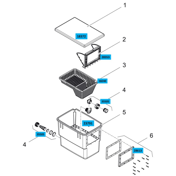 BioSys SkimmerΙσχυρό skimmer για εγκατάσταση στην άκρη της λίμνης. Αφαιρεί επιφάνειες λιμνών έως και 50 m2 χωρίς φύλλα, γύρη και άλλα επιπλέοντα σωματίδια. Το skimmer συνδέεται απευθείας με την επένδυση της λίμνης και μπορεί να αντισταθμίσει τις διακυμάνσεις της στάθμης του νερού έως και 100 mm.ΚαθέκασταΙδανικό για τις άκρες της λίμνηςΕίναι επίσης δυνατή η εγκατάσταση απευθείας στη γη στην άκρη της λίμνης. Αντισταθμίζει τις διακυμάνσεις της στάθμης του νερού έως και 100 mmΒολικό καθάρισμαΒολικός καθαρισμός χάρη στο εύκολο στην αφαίρεση καλάθι σκουπιδιώνBioSys Skimmer +SKU 57137Βασικά ΧαρακτηριστικάΙσχυρή αναρρόφηση επιφανειών λιμνώνΕύκολη προσβασιμότητα στην άκρη της λίμνηςΤο κάλυμμα με εμφάνιση ροκ ταιριάζει τέλεια στο τοπίο της λίμνηςΧαρακτηριστικάΠΕΡΙΟΧΗ ΕΠΙΦΑΝΕΙΑΣ: Αποκαθιστά αποτελεσματικά επιφάνειες λιμνών έως 50 m2ΣΤΕΡΕΩΣΕ ΣΤΕΡΕΑ: Τοποθετήστε το skimmer απευθείας στην άκρη της λίμνης, σταθερά στο χώμαΑΠΛΟ: Απλώς περάστε το skimmer στην επένδυση της λίμνηςΒΟΛΙΚΟ: Η χοντρή βρωμιά αφαιρείται ιδιαίτερα εύκολαΠΕΡΙΛΑΜΒΑΝΕΤΑΙ: Περιλαμβάνεται κάλυμμα με φυσική όψη σαν βράχοΚΑΛΥΤΕΡΗ ΕΠΙΛΟΓΗ: Για λειτουργία με το προαιρετικά διαθέσιμο AquaMax Eco Premium (στο ενσωματωμένο θησαυροφυλάκιο αντλίας)ΠΡΟΣΑΡΜΟΓΗ: Το skimmer προσαρμόζεται ανεξάρτητα σε διακυμάνσεις της στάθμης του νερού έως και 100 mmΤεχνικά ΣτοιχείαΔιαστάσεις (Μ x Π x Υ) mm 580 x 400 x 450Καθαρό βάρος κιλά 5,46Εγγύηση (+ εγγύηση αιτήματος) Έτη 3 + 2Πιθανή διαφορά στάθμης νερού 100 mmΠλάτος ανοίγματος skimmer mm 220Όγκος φίλτρου l 12Επιφάνεια λίμνης, μέγ. m2 50Χωρητικότητα αντλίας, min. l/h 6000Χωρητικότητα αντλίας, μέγ. l/h 16000Συνδέσεις, έξοδος mm 25 / 32 / 38Συνδέσεις εξόδου 1", 1 ¼", 1 ½"BioSys SkimmerPowerful skimmer for installation at the pond edge. It skims pond surfaces up to 50 m2 free of leaves, pollen and other floating particles. The skimmer is flanged directly to the pond liner and can compensate for water level fluctuations of up to 100 mm.DetailsIdeal for pond edgesIt is also possible to install directly into the earth at the edge of the pond. Compensates for water level fluctuations of up to 100 mmConvenient cleaningConvenient cleaning thanks to the easy-to-remove debris basketBioSys Skimmer +SKU 57137Key FeaturesPowerful suction of pond surfacesEasy accessibility at the edge of the pondRock look cover fits perfectly in the pond landscapeCharacteristicsSURFACE AREA: Effectively skims pond surfaces of up to 50 m2FIRMLY FIXED: Install the skimmer directly on the edge of the pond, firmly in the soilSIMPLE: Simply flange the skimmer onto the pond linerCONVENIENT: Coarse dirt is particularly easy to removeINCLUDED: Cover with natural rock-like appearance is includedBEST CHOICE: For operation with the optionally available AquaMax Eco Premium (in the integrated pump vault)ADAPTATION: The skimmer independently adapts to fluctuations in water level up to 100 mmTechnical DataDimensions (L x W x H) mm 580 x 400 x 450Net weight kg 5.46Guarantee (+ request guarantee) Years 3 + 2Possible water level difference 100 mmSkimmer opening width mm 220Filter volume l 12Pond surface, max. m2 50Pump capacity, min. l/h 6000Pump capacity, max. l/h 16000Connections, outlet mm 25 / 32 / 38Outlet connections 1", 1 ¼", 1 ½"Spare PartsPos.ProductSKUQuantity1Decoration lid BioSys Skimmer granite1837212ASM flap Skimmer2835313Debris coll. basket BioSys Skim. 2" 20121824014Pump connection BioSys Skimmer +3550515Filter box BioSys Skimmer printed2379116ASM outer frame2861317Gasket BioSys Skimmer104541