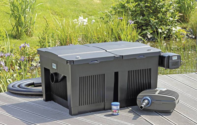 />Αριθμός στοιχείων: 56789Κορυφαία χαρακτηριστικά του προϊόντοςΧαρακτηριστικά προϊόντοςΣυνδυασμός μηχανικού βιολογικού καθαρισμού και αποτελεσματικής τεχνολογίας UVCΣυμπεριλάβετε εγγύηση καθαρού νερού OASEΟ εμπλουτισμός με οξυγόνο μέσω ειδικών διοχέτευσης νερούΚαθαρίστε τις λαβές για βολική συντήρησηΣυμπεριλαμβανομένων των οθονών για το επίπεδο των ρύπων και τη θερμοκρασία του νερούΑποχέτευση ιλύος για εύκολη αφαίρεση των χονδροειδών συντριμμιώνΕύκολη απόκρυψη. το φίλτρο μπορεί να εσοχή στο έδαφος σε ⅓ του ύψους τουΤα φίλτρα και οι αντλίες ταιριάζουν κατά βέλτιστο τρόποΕντός. 100 ml BioKick Starter φίλτρου * μόνο BioSmart Set 18000 - / 36000Κατάλληλο για λίμνες μέχρι 36,0 m³Περιλαμβάνεται στο πεδίο παράδοσης:Vitronic UVC 36 W5 m σωλήνας 1 ½  Item number: 56789Top product characteristics   width= width= width= width= width=    Product characteristicsCombination of mechanical biological cleaning and effective UVC technologyIncl. OASE Clear Water GuaranteeOxygen enrichment through special water channellingCleaning handles for convenient maintenanceIncluding displays for pollutant level and water temperatureSludge drain for easy removal of coarse debrisEasy to conceal; the filter can be recessed into the ground to ⅓ of its heightFilters and pumps are optimally matchedIncl. 100 ml BioKick Filter Starter* only BioSmart Set 18000 - /36000Suitable for ponds up to 36.0 m³Included in the scope of delivery: Vitronic UVC 36 W; 5 m 1 ½” (38 mm) hose and AquaMax Eco Classic 11500: 100 W; 11000 l/h Qmax; 3.3 m HmaxTechnical dataDimensions (L x W x H)mm920 x 600 x 405Rated voltage 220 - 240 V / 50/60 HzPower consumption UVCW36Power consumption pumpW100Power cable length UVCm5.00Power cable length pumpm10.00Net weightkg21.00GuaranteeYears2UVC powerW36Number of blue filter foamsUnit4Number of red filter foamsUnit4Number of green filter foamsUnit1Temperature display YesConnection inletmm19 / 25 / 32 / 38Connection inlet ¾", 1", 1 ¼", 1 ½"Connections, outlet DN 75Connections, sludge discharge DN 50Suitable for ponds up to max.m³36.0Suitable for ponds with fish stockm³18.0Suitable for ponds with koi stockm³9.0Item number 56789EAN 4010052567891Guarantee - yearsPatentClear Water GuaranteeSet conceptEasy cleaningUVC service life - hoursVDE-certified  Details width=Nitrification and de-nitrification zoneToxic ammonia, nitrite and nitrate are effectively transformed into harmless end products in the different foams.  width=Temperature displayThe thermometer indicates the current water temperature at all times.  width=Particularly easy maintenanceAfter activating the cleaning lever, the floor discharge can be opened and coarse debris can be disposed of (only BioSmart Set 18000/24000/36000).  width=UVC unitThe UVC unit integrated in the filter or included in the set ensures fast elimination of algae and reduction of pathogens.PACKETING SMALL PALLET 80x60x84cm 31kg