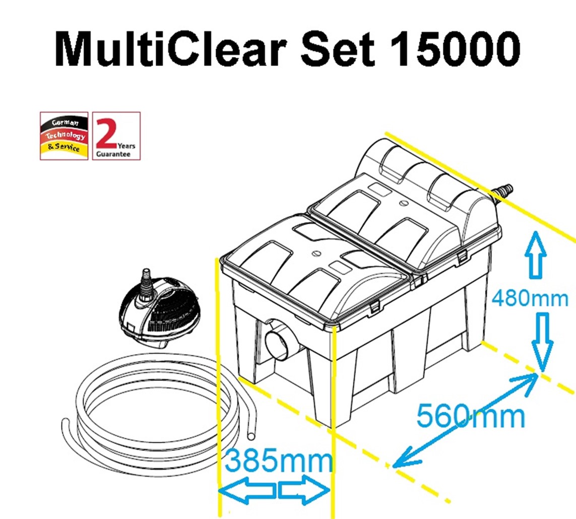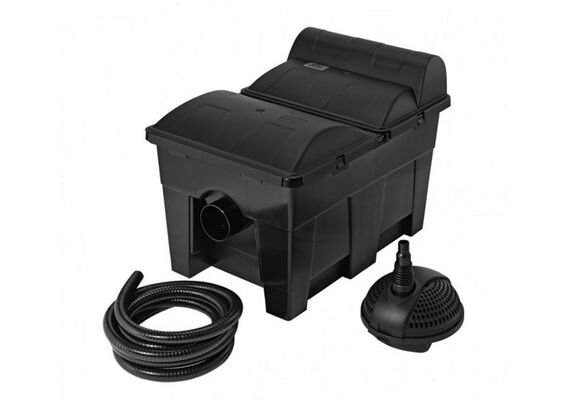 Φίλτρο λίμνης Pontec pond filter MultiClear Set 15000Εγγυημένο καθαρό και υγιές νερό!Το σετ αποτελείται από:Σετ φίλτρου ροής με αρκετούς αφρούς φίλτρουΕνσωματωμένο διαχωριστικό UVCΙσχυρή αντλία φίλτρουΦίλτρο σωλήναΟι καλύτερες στιγμές του προϊόντος με μια ματιά:Ιδανικό για λίμνες έως 15000 λίτρα χωρίς αποθέματα ψαριώνΣυμπεριλαμβάνεται η αντλία φίλτρου με 3500 l / hΜετατόπιση χονδροειδών συντριμμιών σε μέγεθος έως 4 mmΕνσωματωμένο διαλυτικό UVC 7 wattΠεριλαμβάνεται σωλήνας κενού 3 μέτρωνΣυμπεριλαμβάνεται η ποιότητα της Pontec: εγγύηση 2 ετώνΣυμπεριλαμβανομένης της εγγύησης καθαρού νερού!Έτοιμο για σύνδεση και ολοκλήρωση, το συμπαγές φίλτρο ροής μέσω Pontec MultiClear 15000 εξασφαλίζει εγγυημένο καθαρό, υγιές και καθαρό νερό σε λίμνες έως 15000 λίτρα χωρίς αποθέματα ψαριών.Το σετ περιλαμβάνει μια ισχυρή αντλία φίλτρου (3500 l / h) και σωλήνα 3 m (διάμετρος 3/4 ").Το ενσωματωμένο διαυγές UVC (11 W) εξαλείφει αποτελεσματικά τα αιωρούμενα φύκια και τη θολότητα.Σε συνδυασμό με το φίλτρο ροής με διαφορετικούς αφρούς φίλτρου, το σετ προσφέρει εγγύηση καθαρού νερού.Χάρη στον δείκτη στάθμης ρύπων και την αποστράγγιση πυθμένα, η συντήρηση του φίλτρου αντιμετωπίζεται εύκολα και άνετα. Pond filter MultiClear Set 15000Guaranteed clear and healthy water!The set consists of:Flow-through filter set with several filter foamsIntegrated UVC clarifierPowerful filter pumpFilter hoseProduct highlights at a glance:Ideal for ponds up to 15000 l without fish stockIncluding filter pump with 3500 l/hDisplacement of coarse debris up to 4 mm in sizeIntegrated 7 watt UVC clarifierIncluding 3 m vacuum hoseIncluding Pontec quality promise: 2-year guaranteeIncluding Clear Water Guarantee!Ready-to-connect and complete, the compact Pontec MultiClear 15000 flow-through filter ensures guaranteed clear, healthy and clean water in ponds up to 15000 litres without fish stock. The set includes a powerful filter pump (3500 l/h) and 3 m hose (3/4" diameter). The integrated UVC clarifier (11 W) effectively eliminates suspended algae and turbidity. Combined with the flow-through filter with different filter foams, the set offers a Clear Water Guarantee. Thanks to a pollutant level indicator and bottom drain, filter maintenance is handled easily and conveniently.