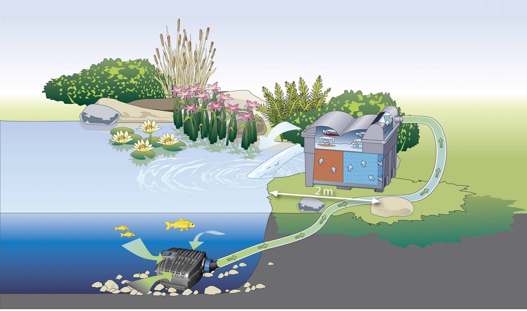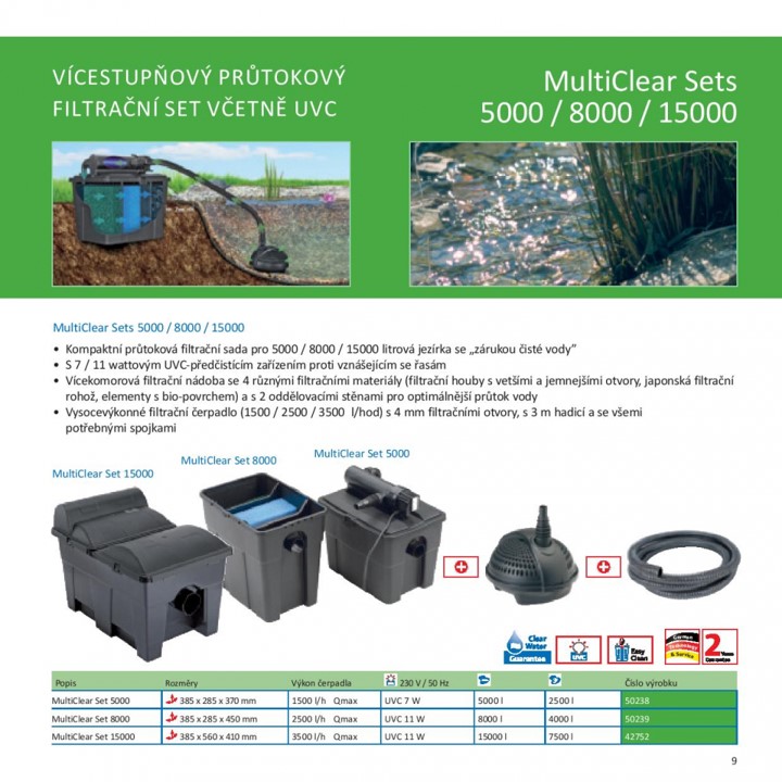 Φίλτρο λίμνης Pontec pond filter MultiClear Set 5000Εγγυημένο καθαρό και υγιές νερό!Το σετ αποτελείται από:Σετ φίλτρου ροής με αρκετούς αφρούς φίλτρουΕνσωματωμένο διαχωριστικό UVCΙσχυρή αντλία φίλτρουΦίλτρο σωλήναΟι καλύτερες στιγμές του προϊόντος με μια ματιά:Ιδανικό για λίμνες έως 5000 λίτρα χωρίς αποθέματα ψαριώνΣυμπεριλαμβάνεται η αντλία φίλτρου με 1500 l / hΜετατόπιση χονδροειδών συντριμμιών σε μέγεθος έως 4 mmΕνσωματωμένο διαλυτικό UVC 7 wattΠεριλαμβάνεται σωλήνας κενού 3 μέτρωνΣυμπεριλαμβάνεται η ποιότητα της Pontec: εγγύηση 2 ετώνΣυμπεριλαμβανομένης της εγγύησης καθαρού νερού!Έτοιμο για σύνδεση και ολοκλήρωση, το συμπαγές φίλτρο ροής μέσω Pontec MultiClear 5000 εξασφαλίζει εγγυημένο καθαρό, υγιές και καθαρό νερό σε λίμνες έως 5000 λίτρα χωρίς αποθέματα ψαριών.Το σετ περιλαμβάνει μια ισχυρή αντλία φίλτρου (1500 l / h) Το ενσωματωμένο διαυγές UVC (7 W) εξαλείφει αποτελεσματικά τα αιωρούμενα φύκια και τη θολότητα.Σε συνδυασμό με το φίλτρο ροής με διαφορετικούς αφρούς φίλτρου, το σετ προσφέρει εγγύηση καθαρού νερού.Χάρη στον δείκτη στάθμης ρύπων και την αποστράγγιση πυθμένα, η συντήρηση του φίλτρου αντιμετωπίζεται εύκολα και άνετα.  Pond filter MultiClear Set 5000Guaranteed clear and healthy water!The set consists of:Flow-through filter set with several filter foamsIntegrated UVC clarifierPowerful filter pumpFilter hoseProduct highlights at a glance:Ideal for ponds up to 5000 l without fish stockIncluding filter pump with 1500 l/hDisplacement of coarse debris up to 4 mm in sizeIntegrated 7 watt UVC clarifierIncluding 3 m vacuum hoseIncluding Pontec quality promise: 2-year guaranteeIncluding Clear Water Guarantee!Ready-to-connect and complete, the compact Pontec MultiClear 5000 flow-through filter ensures guaranteed clear, healthy and clean water in ponds up to 15000 litres without fish stock. The set includes a powerful filter pump (1500 l/h) and 3 m hose The integrated UVC clarifier (7 W) effectively eliminates suspended algae and turbidity. Combined with the flow-through filter with different filter foams, the set offers a Clear Water Guarantee. Thanks to a pollutant level indicator and bottom drain, filter maintenance is handled easily and conveniently.